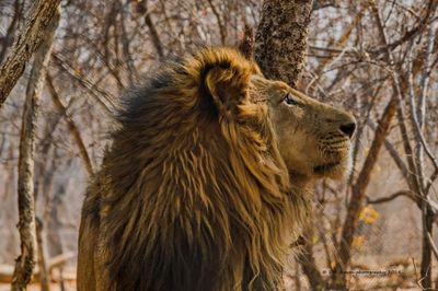 Lion profile in Fuller Forest, Victoria Falls, Zimbabwe, Africa. He was part of a breeding program that release the young lions back into the wild.